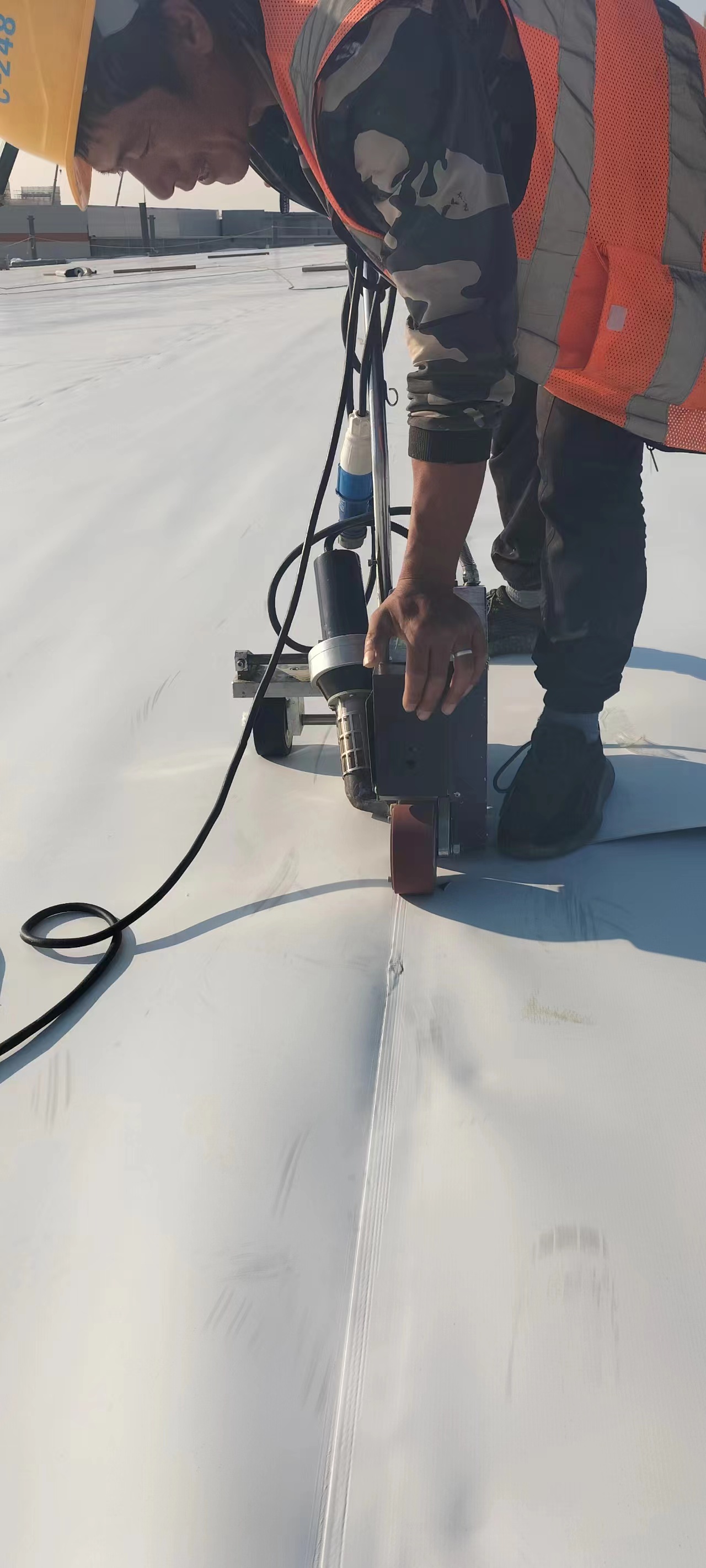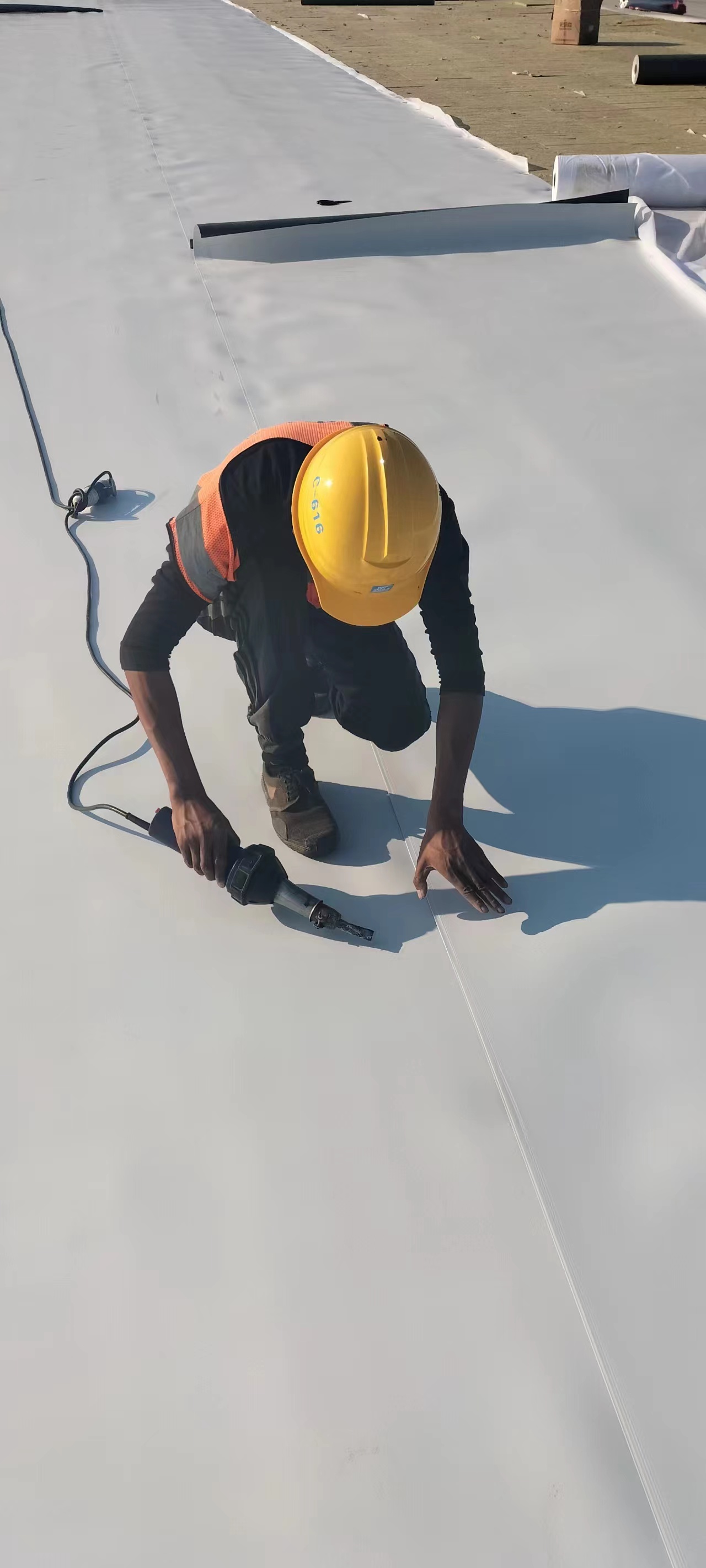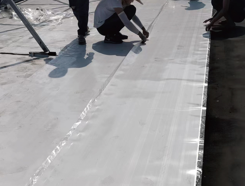 屋面平面周边与立面交接处PTO卷材用通长铁压条固定,立面钢制压条上口用塑料焊绳通长焊接,在平面与立面交接处用150mm宽通长PTO卷材覆盖、接缝与大面卷材焊接严密。根据设计和规范抗风揭要求,在屋面四周和年最大频率风向位置按要求裁取小于TPO幅宽的卷材,加密固定点以满足抗风揭要求。屋面上大于500mm*500mm的穿出构件,其周边应使用压条固定,立面钢制压条上口用塑料焊丝通长焊接,在平面与立面交接处用200mm宽通长PTO卷材覆盖、接缝与大面卷材焊接严密。优先使用阴阳角预制件,也可以采用均质TPO片材按图示形状裁剪,焊枪热熔。阴阳角处增铺卷材附加层,优先使用阴阳角预制件,也可以采用均质TPO片材按图示形状裁剪,焊枪热熔。